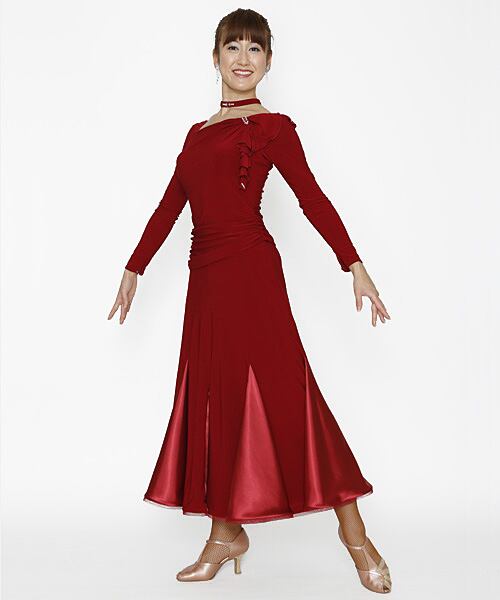 ニット生地を使用したワンピース。スカート部のマチにサテン、裾にホースヘアを使用しました。胸元と腹部のドレープがエレガントな印象をあたえます。ワンポイントの石がアクセントになっています。後ファスナー。