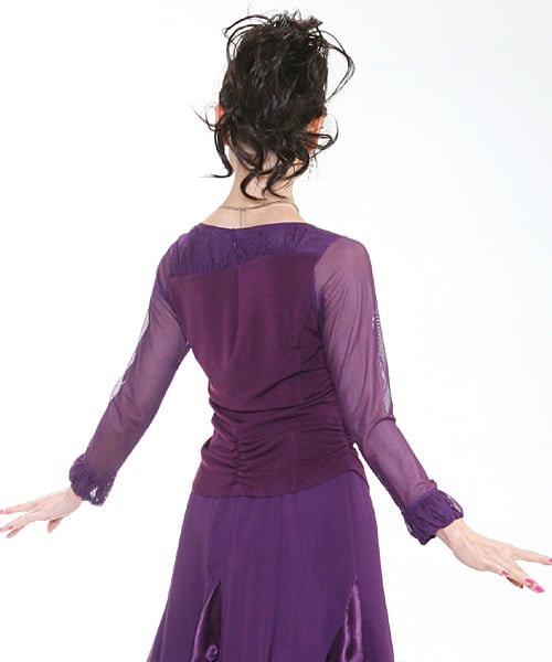 身頃にニットを使用したトップス。襟元と袖にメッシュを採用し、サイドとバック裾にギャザーを施しました。それぞれの切り替えラインに特徴があるスッキリした商品です。後ファスナーです。