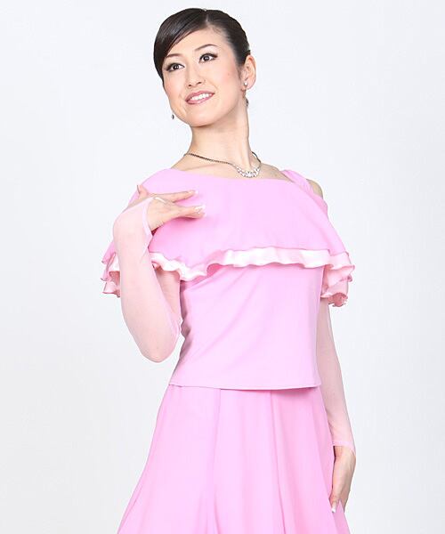 身頃にニットを使用したブラウス。袖にメッシュを使用。胸元にシフォンジョーゼットとサテン生地の大きめなフリルをあしらったエレガントな商品です。
