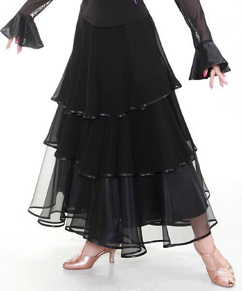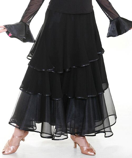 シフォンジョーゼットを使用した8枚ハギ3段ロングスカート。3段目のスカートのみを斜めにし、リズム感を出しました。裾に施したサテンテープがエレガントな印象を与えます。脇ゴム・後ファスナーです。